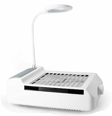 Das 3 in 1-Gerät von YUYTE-Store kombiniert die Staubabsaugung mit einem leistungsstarken Fräser (25.000 U/Min) und einem 54 Watt UV-LED-Lichthärtungsgerät. Das integrierte Lichthärtungsgerät eignet sich für die Aushärtung von zwei Händen gleichzeitig. Zwei USB-Anschlüsse ermöglichen das Anschließen der mitgelieferten USB-LED-Lampe, während gleichzeitig das Handy geladen werden kann.