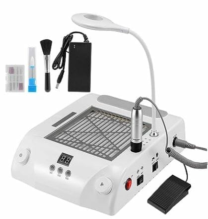 Das 6 in 1-Gerät von HUKOER ist ausgestattet mit einem leistungsstarken Nagelfräser (35.000 U/Min), einer flexiblem LED-Lampe, einer 48 Watt UVLampe, einem 40 Watt Staubabsaugung, einer Aufbewahrungsbox für den Schleifkopf des Fräsers sowie einem Fußpedal zur Geschwindigkeitsregulierung des Fräsers. Mit diesem umfangreichen Funktionsumfang ist das Gerät ein echter Alleskönner zu einem vergleichsweise günstigen Preis.